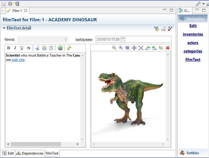 Adichatz provides Entity Editors for managing inside one editor detail of an entity and all related objects (dependencies) of this one.
